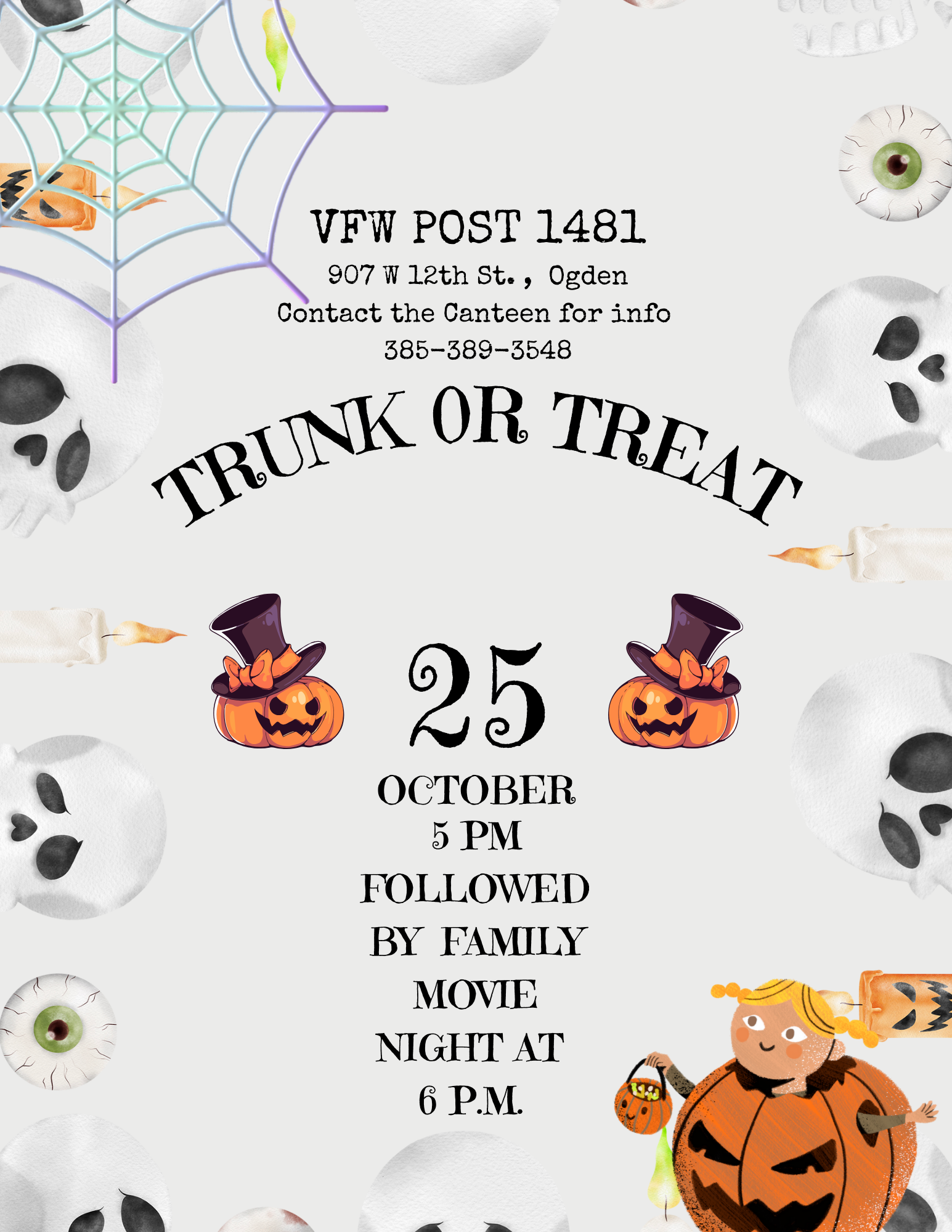 Please Note the Post/Canteen has a new phone # 385-389-3548Flag Retirement at the Post, October 11, 9 a.m.October 23, Auxilary Bunco Bash, .ALL SEATS ARE FILLED!